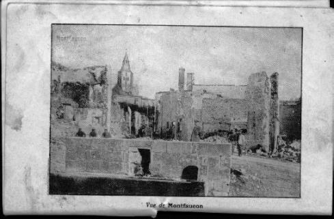 Nous filons vers Montfaucon par Dannevoux et Sepisarges. Pendant 4 ou 5 jours, de terribles luttes sont livrées à Dun, Cunel, Romagne, mais le flot boche, constamment accru, nous déborde. L'ordre est de céder toujours le terrain malgré d'incessants avantages remportés par nos troupes. Pendant 4 ou 5 jours nous occupons Montfaucon et, de la terrasse qui domine la vallée derrière le cimetière, nous voyons brûler successivement Dannevoux et Sepisarges. Quelle tristesse !